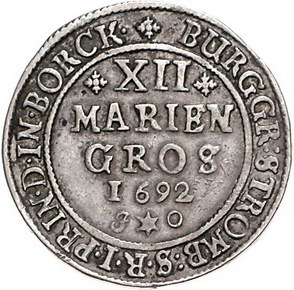 Los-Nummer: Auktion 51 - 1154 Altdeutsche Münzen und Medaillen Münster, Bistum Friedrich Christian von Plettenberg 1688-1706, 12 Mariengroschen 1692 JO. Kleine Inschrift. Schulze 129 c. Sehr schön + Schätzpreis: 200,- Zuschlag: 200,- |
