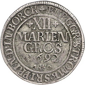 Los-Nummer: Auktion 51 - 1155 Altdeutsche Münzen und Medaillen Münster, Bistum Friedrich Christian von Plettenberg 1688-1706, 12 Mariengroschen 1692 JO. Große Inschrift. Schulze 129 d. Sehr schön Schätzpreis: 150,- Zuschlag: 120,- |