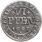 Los-Nummer: Auktion 51 - 1157 Altdeutsche Münzen und Medaillen Münster, Bistum Friedrich Christian von Plettenberg 1688-1706, 1/24 Taler 1692, 1693. 1/48 Taler 1692. 6 Pfennig 1695 (mit Wertzahl 56), 1696. Cu 4 Pfennig 1703. Cu 3 Pfennig 1703. Schulze 131-132 , 138, 150 d, 155, 163-164. 7 Stück. Meist sehr schön Schätzpreis: 125,- Zuschlag: 100,- |