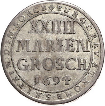Los-Nummer: Auktion 51 - 1165 Altdeutsche Münzen und Medaillen Münster, Bistum Friedrich Christian von Plettenberg 1688-1706, 24 Mariengroschen 1694 JO. Spanisches Wappen. Mit GROSCH. Keine + unter den Münzmeisterinitialen. Schulze zu 143 d, Davenport 693. Sehr schön Schätzpreis: 200,- Zuschlag: unverkauft |