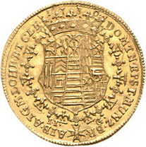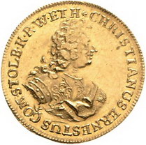 Los-Nummer: Auktion 51 - 1814 Altdeutsche Münzen und Medaillen Stolberg-Wernigerode Christian Ernst 1710-1771, Dukat 1730, Wernigerode. Geharnischtes und drapiertes Brustbild mit großer Allongeperücke nach rechts / Elffeldiges Wappen mit Fürstenkrone und der Kette des Schwarzen Adlerordens, unten die Münzmeisterinitialen IIG des Johann Jeremias Gründler. Stempel von Christian Wermuth. Friederich 1405, Friedberg 3359. GOLD. Sehr selten. Vorzüglich - Stempelglanz Schätzpreis: 9000,- Zuschlag: unverkauft |