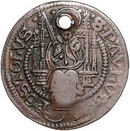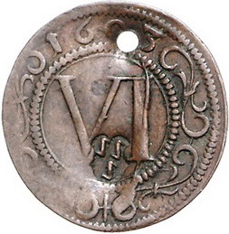 Los-Nummer: Auktion 51 - 1213 Altdeutsche Münzen und Medaillen Münster, Domkapitel Cu 6 Pfennig 1603 mit Gegenstempel Drei Wolfsangeln (Brabeck) auf der Rückseite. Weinrich 27 a, Weingärtner 14 a. Von größter Seltenheit. Gelocht, sehr schön + Schätzpreis: 300,- Zuschlag: 240,- |