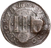 Los-Nummer: Auktion 51 - 1217 Altdeutsche Münzen und Medaillen Münster, Domkapitel Cu 3 Pfennig 1608 mit Gegenstempeln 1654 über Schild und Drei Wolfsangeln (Brabeck). Weinrich 34 a, Weingärtner 25. Sehr selten. Sehr schön Schätzpreis: 200,- Zuschlag: unverkauft |