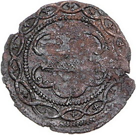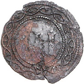Los-Nummer: Auktion 51 - 1243 Altdeutsche Münzen und Medaillen Münster, Stadt Cu Mühlenzeichen zu 6 Pfennig o.J. (16. Jahrhundert). Münsterscher Balkenschild in einem Perlreif, außen herum zwei verschlungene Bänder, die sich vierzehnmal kreuzen, und so vierzehn Kreuze umschließen / Wertzahl VI in Faden- und Perlreif, außen herum die gleiche Verzierung wie auf der Vorderseite. Bei 6 Uhr Gegenstempel M. Von größter Seltenheit. Etwas korrodiert, leichter Randausbruch, fast sehr schön Schätzpreis: 1250,- Zuschlag: unverkauft |
