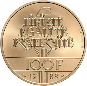 Los-Nummer: Auktion 51 - 3035 Ausländische Münzen und Medaillen Frankreich Fünfte Republik. Seit 1959, 100 Francs 1988. Brüderlichkeit. K.M. 966 b, Friedberg 608. GOLD. Stempelglanz Schätzpreis: 350,- Zuschlag: 380,- |