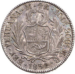 Los-Nummer: Auktion 51 - 3594 Ausländische Münzen und Medaillen Peru Republik seit 1821, 4 Reales 1854 MB, Lima. Grunthal/Sellschopp 681 i. Prachtexemplar. Herrliche Patina. Fast Stempelglanz Schätzpreis: 250,- Zuschlag: 310,- |