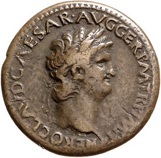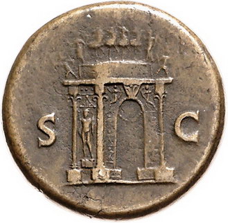 Los-Nummer: Auktion 51 - 9 Römische Münzen Kaiserzeit Nero 54-68, Sesterz 65, Lugdunum. Belorbeerter Kopf nach rechts / S-C Eintoriger Triumphbogen in perspektivischer Darstellung, links steht Mars, oben Kaiser in Quadriga zwischen Viktoria und Pax. RIC 392, BMC 329. Prägeschwäche, sehr schön Schätzpreis: 200,- Zuschlag: 260,- |