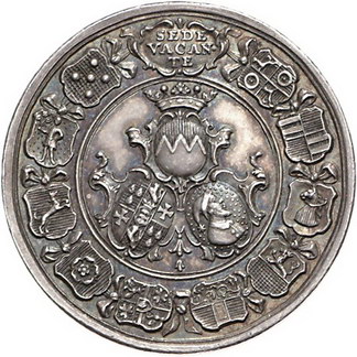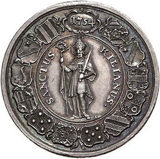 Los-Nummer: Auktion 51 - 1920 Altdeutsche Münzen und Medaillen Würzburg, Bistum Sedisvakanz 1754, Medaille 1754, von Oexlein. Drei Wappen im Kranz der zehn Kapitelwappen / St. Kilian umgeben von den Wappen von zwölf weiteren Domherren. Helmschrott 700, Zepernick 260. 33 mm, 14,55 g. Schöne Patina. Vorzüglich + Schätzpreis: 250,- Zuschlag: 240,- |