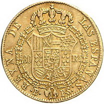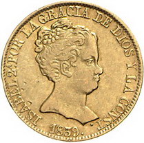 Los-Nummer: Auktion 51 - 4026 Ausländische Münzen und Medaillen Spanien Isabel II. 1833-1868, 80 Reales 1839 B/PS, Barcelona. Calicó/Trigo 55, Friedberg 324. GOLD. Sehr schön - vorzüglich Schätzpreis: 250,- Zuschlag: 200,- |