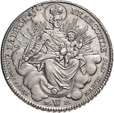 Los-Nummer: Auktion 51 - 1922 Altdeutsche Münzen und Medaillen Würzburg, Bistum Adam Friedrich von Seinsheim 1755-1779, Taler 1776. Drapiertes Brustbild in besticktem Talar nach rechts / Madonna mit Zepter und Kind von Strahlen umgeben auf Wolke. Helmschrott 764, Davenport 2902. Winz. Schrötlingsfehler, vorzüglich Schätzpreis: 400,- Zuschlag: unverkauft |