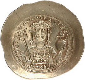 Los-Nummer: Auktion 51 - 15 Byzanz Michael VII. Ducas 1071-1078, Histamenon, Konstantinopel. 4,35 g. Christus mit Evangelienbuch von vorn, links im Feld IC, rechts XC / Büste mit Labarum und Kreuzglobus von vorn. Sear 1868, Friedberg 264. GOLD. Sehr schön - vorzüglich Schätzpreis: 200,- Zuschlag: 210,- |