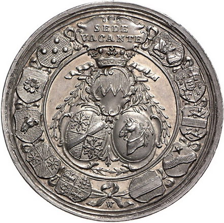 Los-Nummer: Auktion 51 - 1930 Altdeutsche Münzen und Medaillen Würzburg, Bistum Sedisvakanz 1795, Medaille 1795, von Werner. Madonna über drei Heiligen / Drei Wappen umgeben von zehn weitere Wappen. Helmschrott 943, Zepernick 263. 45,5 mm, 29,19 g. Schöne Patina. Vorzüglich - Stempelglanz Schätzpreis: 600,- Zuschlag: 675,- |