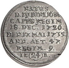 Los-Nummer: Auktion 51 - 182 Altdeutsche Münzen und Medaillen Brandenburg-Bayreuth Georg Friedrich Karl 1726-1735, 1/24 Taler 1735. Auf seinen Tod. Slg. Wilmersdörffer 715. Winz. Schrötlingsfehler, sehr schön - vorzüglich Schätzpreis: 50,- Zuschlag: 60,- |