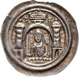 Los-Nummer: Auktion 51 - 197 Altdeutsche Münzen und Medaillen Brandenburg-Preußen Albrecht der Bär 1134-1157, Brakteat, Wegeleben. 0,87 g. Brustbild des Markgrafen mit Schwert und Fahne von vorn unter einem hohen Bogen, der von zwei Türmen flankiert wird, oben ein weiterer Turm. Bahrfeldt 27, Thormann 14, Slg. Bonhoff 538, Slg. Löbbecke 394 , Berger 1752, Fd. Freckleben 12. Schöne Patina. Winz. Randfehler, vorzüglich Schätzpreis: 750,- Zuschlag: 1250,- |