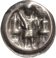 Los-Nummer: Auktion 51 - 208 Altdeutsche Münzen und Medaillen Brandenburg-Preußen Otto II. 1184-1205, Brakteat. 0,92 g. Stehender Markgraf mit Schwert und Fahne zwischen zwei Türmen. Bahrfeldt 72, Slg. Bonhoff 804, Berger 1681. Sehr schön Schätzpreis: 100,- Zuschlag: unverkauft |