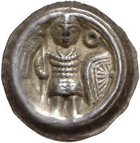 Los-Nummer: Auktion 51 - 214 Altdeutsche Münzen und Medaillen Brandenburg-Preußen Otto II. 1184-1205, Brakteat, Stendal? 0,88 g. Markgraf mit Fahne und Schild, darüber Ringel. Bahrfeldt 87, Slg. Bonhoff 809. Prägeschwäche, vorzüglich Schätzpreis: 150,- Zuschlag: 230,- |