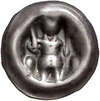 Los-Nummer: Auktion 51 - 217 Altdeutsche Münzen und Medaillen Brandenburg-Preußen Otto II. 1184-1205, Brakteat, Stendal? 0,94 g. OTTO Markgraf mit Schwert und Fahne zwischen zwei Türmen. Bahrfeldt 92 b, Slg. Bonhoff 811. Fast sehr schön Schätzpreis: 100,- Zuschlag: 80,- |