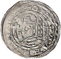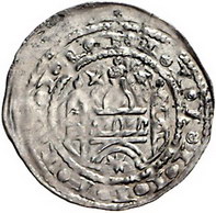 Los-Nummer: Auktion 51 - 220 Altdeutsche Münzen und Medaillen Brandenburg-Preußen Otto II. 1184-1205, Pfennig, Salzwedel. 0,53 g. OTTO MARIIO EST Brustbild links mit Lilie und Schwert / Trugschrift. Gebäude mit drei Kuppeltürmen. Bahrfeldt 97, Slg. Bonhoff 818, Eberhagen 1, Dannenberg 1. Sehr schön Schätzpreis: 125,- Zuschlag: 120,- |