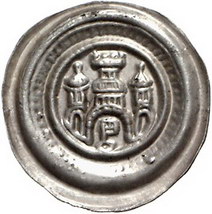 Los-Nummer: Auktion 51 - 221 Altdeutsche Münzen und Medaillen Brandenburg-Preußen Otto II. 1184-1205, Brakteat, Salzwedel. 0,51 g. Dreitürmiges Gebäude, im Portal der Schlüssel. Bahrfeldt 104, Slg. Bonhoff 839, Eberhagen 9. Vorzüglich Schätzpreis: 100,- Zuschlag: 200,- |