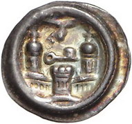 Los-Nummer: Auktion 51 - 223 Altdeutsche Münzen und Medaillen Brandenburg-Preußen Heinrich von Gardelegen 1184-1192, Brakteat, Salzwedel. 0,66 g. Segnende Hand Gottes über Schlüssel, der sich zwischen den seitlichen Kuppeltürmen einer Mauerbrüstung befindet, davor ein kleinerer Zinnenturm. Bahrfeldt 111, Eberhagen 16, Slg. Bonhoff 842 , Berger 1693. Schöne Patina. Sehr schön Schätzpreis: 200,- Zuschlag: 280,- |