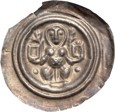 Los-Nummer: Auktion 51 - 1443 Altdeutsche Münzen und Medaillen Quedlinburg-Gera, Münzstätte der Abtei . Jahrhundert. Agnes von Meißen bis Betradis II. Brakteat. 0,77 g. Sitzende Äbtissin mit zwei Büchern, über der Rechten Weidenzweig, über der Linken Palmzweig, unter jedem Buch ein Punkt. Mehl 335, Schmidt u. Knab 38 a, Hausmann GA 32. Randfehler, fast vorzüglich Schätzpreis: 300,- Zuschlag: 675,- |