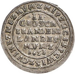 Los-Nummer: Auktion 51 - 351 Altdeutsche Münzen und Medaillen Brandenburg-Preußen Friedrich Wilhelm 1640-1688, 2 Groschen 1653, Berlin. v. Schrötter 977. Fast vorzüglich Schätzpreis: 50,- Zuschlag: 45,- |