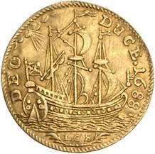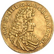 Los-Nummer: Auktion 51 - 373 Altdeutsche Münzen und Medaillen Brandenburg-Preußen Friedrich III. 1688-1701, Guinea-Dukat 1688 LCS Berlin. Drapiertes Brustbild mit großer Allongeperücke nach rechts / Dreimaster. v. Schrötter 23, Bahrfeldt 448, Friedberg 2285. GOLD. Minimal gewellt, sehr schön + Schätzpreis: 5000,- Zuschlag: 11000,- |