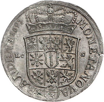 Los-Nummer: Auktion 51 - 376 Altdeutsche Münzen und Medaillen Brandenburg-Preußen Friedrich III. 1688-1701, 2/3 Taler 1693 LCS, Berlin. Deutscher Harnisch. v. Schrötter 129, Davenport 271. Schrötlingsfehler am Rand, vorzüglich Schätzpreis: 200,- Zuschlag: unverkauft |