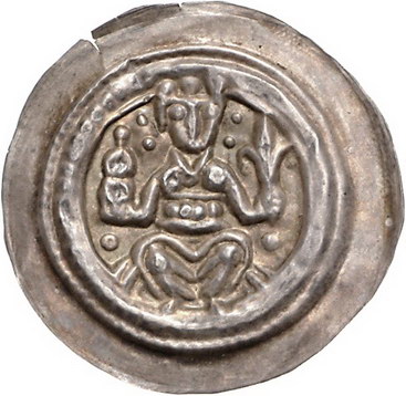 Los-Nummer: Auktion 51 - 1492 Altdeutsche Münzen und Medaillen Saalfeld, königliche Münzstätte Friedrich I. Barbarossa 1152-1190, Brakteat. 0,95 g. Sitzender Kaiser mit Doppelreichsapfel und Lilie von vorn. Slg. Bonhoff 1133, Berger 2062. Sehr schön Schätzpreis: 175,- Zuschlag: 280,- |
