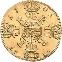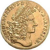 Los-Nummer: Auktion 51 - 390 Altdeutsche Münzen und Medaillen Brandenburg-Preußen Friedrich I. 1701-1713, Dukat 1701 LCS, Berlin. Auf seine Krönung. Belorbeertes Brustbild nach rechts / Gekrönte Monogramme um Wappenschild. v. Schrötter 7, Friedberg 2296. GOLD. Vorzüglich + Schätzpreis: 3000,- Zuschlag: 7000,- |