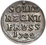 Los-Nummer: Auktion 51 - 394 Altdeutsche Münzen und Medaillen Brandenburg-Preußen Friedrich I. 1701-1713, Schilling 1702 CG, Königsberg. v. Schrötter 359 ff. Vorzüglich Schätzpreis: 30,- Zuschlag: 46,- |