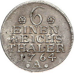 Los-Nummer: Auktion 51 - 416 Altdeutsche Münzen und Medaillen Brandenburg-Preußen Friedrich II. 1740-1786, 1/6 Taler 1764 A, Berlin. Olding 80 a. Fast vorzüglich Schätzpreis: 40,- Zuschlag: 60,- |