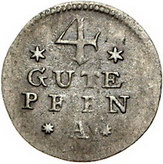 Los-Nummer: Auktion 51 - 437 Altdeutsche Münzen und Medaillen Brandenburg-Preußen Friedrich II. 1740-1786, 4 Gute Pfennig 1766 A, Berlin. Olding 280. Sehr schön + Schätzpreis: 50,- Zuschlag: 70,- |