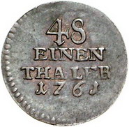 Los-Nummer: Auktion 51 - 455 Altdeutsche Münzen und Medaillen Brandenburg-Preußen Friedrich II. 1740-1786, 1/48 Taler 1761, Leipzig. Sächsisch-polnisches Gepräge. Olding 478. Sehr schön Schätzpreis: 50,- Zuschlag: 55,- |