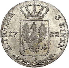 Los-Nummer: Auktion 51 - 476 Altdeutsche Münzen und Medaillen Brandenburg-Preußen Friedrich Wilhelm II. 1786-1797, 1/3 Taler 1788 B, Breslau. Jaeger 22. Fast vorzüglich Schätzpreis: 50,- Zuschlag: 95,- |
