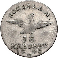 Los-Nummer: Auktion 51 - 497 Altdeutsche Münzen und Medaillen Brandenburg-Preußen Friedrich Wilhelm III. 1797-1840, 18 Kreuzer 1808 G, Glatz. Jaeger 14, AKS 46. Fast sehr schön Schätzpreis: 150,- Zuschlag: 260,- |