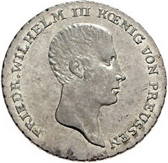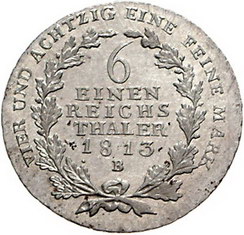 Los-Nummer: Auktion 51 - 502 Altdeutsche Münzen und Medaillen Brandenburg-Preußen Friedrich Wilhelm III. 1797-1840, 1/6 Taler 1813 B, Glatz. Jaeger 31, AKS 24. Vorzüglich - Stempelglanz Schätzpreis: 100,- Zuschlag: 110,- |
