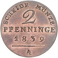 Los-Nummer: Auktion 51 - 509 Altdeutsche Münzen und Medaillen Brandenburg-Preußen Friedrich Wilhelm III. 1797-1840, Cu 2 Pfennig 1839 A. Jaeger 43, AKS 34. Vorzüglich - Stempelglanz Schätzpreis: 50,- Zuschlag: 70,- |