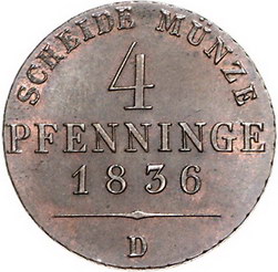 Los-Nummer: Auktion 51 - 510 Altdeutsche Münzen und Medaillen Brandenburg-Preußen Friedrich Wilhelm III. 1797-1840, Cu 4 Pfennig 1836 D. Jaeger 45, AKS 32. Vorzüglich + Schätzpreis: 50,- Zuschlag: 75,- |
