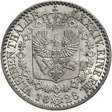 Los-Nummer: Auktion 51 - 511 Altdeutsche Münzen und Medaillen Brandenburg-Preußen Friedrich Wilhelm III. 1797-1840, 1/6 Taler 1828 D. Jaeger 58 a, AKS 26. Vorzüglich Schätzpreis: 50,- Zuschlag: 40,- |