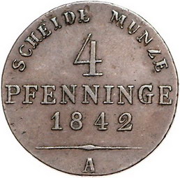 Los-Nummer: Auktion 51 - 540 Altdeutsche Münzen und Medaillen Brandenburg-Preußen Friedrich Wilhelm IV. 1840-1861, Cu 4 Pfennig 1842 A. Jaeger 45, AKS 89. Sehr schön + Schätzpreis: 50,- Zuschlag: 85,- |