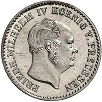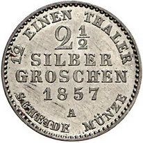 Los-Nummer: Auktion 51 - 545 Altdeutsche Münzen und Medaillen Brandenburg-Preußen Friedrich Wilhelm IV. 1840-1861, 2 1/2 Silbergroschen 1857 A. Riffelrand. Jaeger 78, AKS 84. Vorzüglich Schätzpreis: 50,- Zuschlag: 50,- |