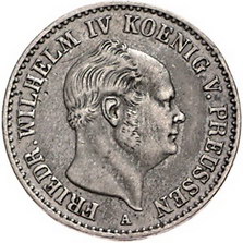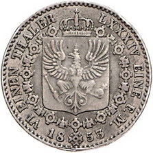 Los-Nummer: Auktion 51 - 546 Altdeutsche Münzen und Medaillen Brandenburg-Preußen Friedrich Wilhelm IV. 1840-1861, 1/6 Taler 1853 A. Jaeger 79, AKS 81. Sehr schön Schätzpreis: 100,- Zuschlag: 130,- |