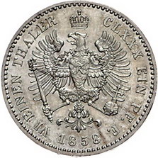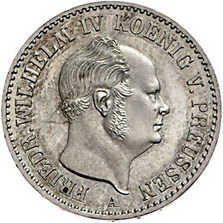 Los-Nummer: Auktion 51 - 549 Altdeutsche Münzen und Medaillen Brandenburg-Preußen Friedrich Wilhelm IV. 1840-1861, 1/6 Taler 1858 A. Jaeger 83, AKS 82. Vorzüglich - Stempelglanz Schätzpreis: 250,- Zuschlag: 290,- |