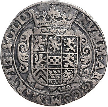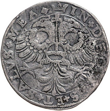 Los-Nummer: Auktion 51 - 1068 Altdeutsche Münzen und Medaillen Mark, Grafschaft Georg Wilhelm von Brandenburg 1619-1640, 20 Schilling o.J., Huissen. NVMM.ARG.COM.MAR.VIG.SOLID Gekröntes verziertes neunfeldiges Wappen mit märkischem Mittelschild / IN+DEO+SPES+ET+SALVS+MEA+ Gekrönter Doppeladler mit Reichsapfel auf der Brust. Menadier 110 var, Slg. Lejeune 1357 var , Noss in Bl.f.Mzfr. 58, 1923 Seite 329-331. Äußerst selten. Fast sehr schön Schätzpreis: 1500,- Zuschlag: 1200,- |