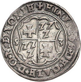 Los-Nummer: Auktion 51 - 2828 Ausländische Münzen und Medaillen Baltikum-Riga, Erzbistum Wilhelm von Brandenburg 1540-1563, 1/2 Mark 1553. Gemeinschaftsprägung mit Heinrich von Galen. Neumann 264 b, Haljak 237. Sehr schön + Schätzpreis: 1000,- Zuschlag: 1000,- |