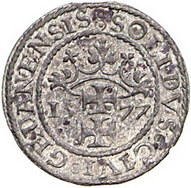 Los-Nummer: Auktion 51 - 3618 Ausländische Münzen und Medaillen Polen-Danzig Notmünzen während der Belagerung 1577, Schilling 1577. Christus mit Reichsapfel / Stadtwappen. Trennungszeichen Kreuz. Gumowski 774, Slg. Marienburg 8088, Kopicki 7387, Dutkowski / Suchanek 103 b. Leicht korrodiert, sehr schön Schätzpreis: 200,- Zuschlag: unverkauft |