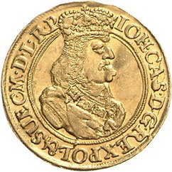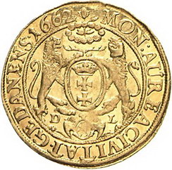 Los-Nummer: Auktion 51 - 3620 Ausländische Münzen und Medaillen Polen-Danzig Johann Casimir 1648-1668, Dukat 1662. Münzmeister Daniel Lesse. Gekröntes Brustbild nach rechts / Zwei Löwen halten Danziger Wappen, am Fuß des Schildes kleines Löwenwappen zwischen den Initialen des Münzmeisters. Gumowski 1929, Slg. Marienburg 8458, Kopicki 7667 (R3), Dutkowski/Suchanek 317 I, Friedberg 24, H.-Cz. 2228. GOLD. Minimal gewellt, vorzüglich - Stempelglanz Schätzpreis: 3000,- Zuschlag: unverkauft |