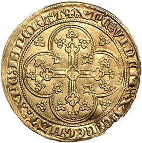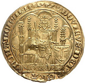 Los-Nummer: Auktion 51 - 96 Altdeutsche Münzen und Medaillen Bayern Ludwig IV. der Bayer 1317-1347, Goldener Schild, Antwerpen. Sitzender Herrscher in gotischem Gestühl, rechts Adlerschild / Verziertes Blumenkreuz in Vierpass. Wittelsbach 67 var, Delmonte 223, Friedberg 176. GOLD. Winz. Schrötlingsfehler am Rand, vorzüglich Schätzpreis: 750,- Zuschlag: 1100,- |