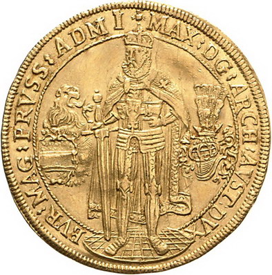 Los-Nummer: Auktion 51 - 737 Altdeutsche Münzen und Medaillen Deutscher Orden Maximilian I. 1590-1618, 6 Dukaten 1603. Stehender Hochmeister zwischen Turnierhelm mit Pfauenspiegel rechts und Löwe mit Bindenschild links / Turnierreiter und Jahreszahl umgeben von 14 Wappen. Neumann 108 b, Dudik 187 Anm. (5 Dukaten), Moser-Tursky Seite 226 Anm. 53, Friedberg 3379 d, Prokisch 60.2 , Enzenberg 26, Egg 372. 20,87 g. GOLD. Sehr selten. Minimal gewellt, vorzüglich Schätzpreis: 10000,- Zuschlag: unverkauft |